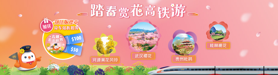 春暖花开,万物复苏,三月、四月正是出游赏花的好时节。高铁联同各大旅行社推出多款“赏花团”,带你乘高铁直达内地多个最美赏花胜地──无论是武汉东湖樱花、桂林阳朔桃花、贵州百里杜鹃,还是河源黄花风铃……乘坐高铁出游,你可以一路上网、一路欣赏沿途风景,从香港出发,只需几小时车程即可直达多个热门赏花城市;下车后无需再排队过关,轻轻松松就能出发去赏花!